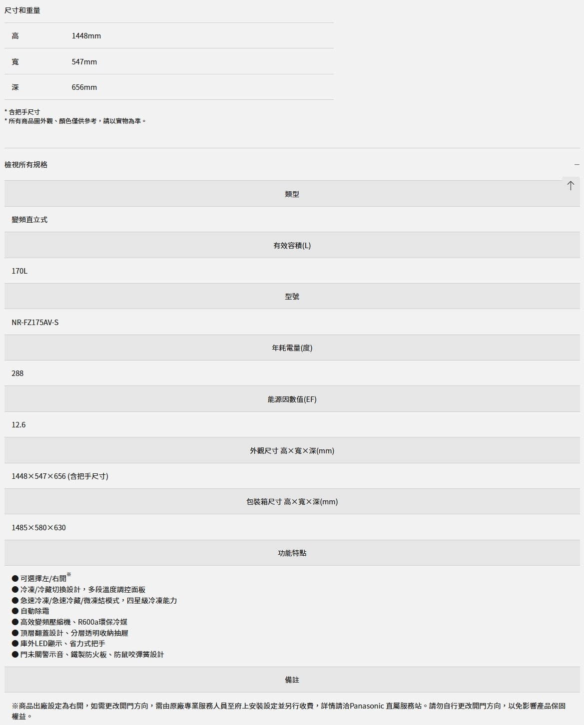 Panasonic 國際牌 直立式冷凍/冷藏櫃 NR-FZ175AV-S