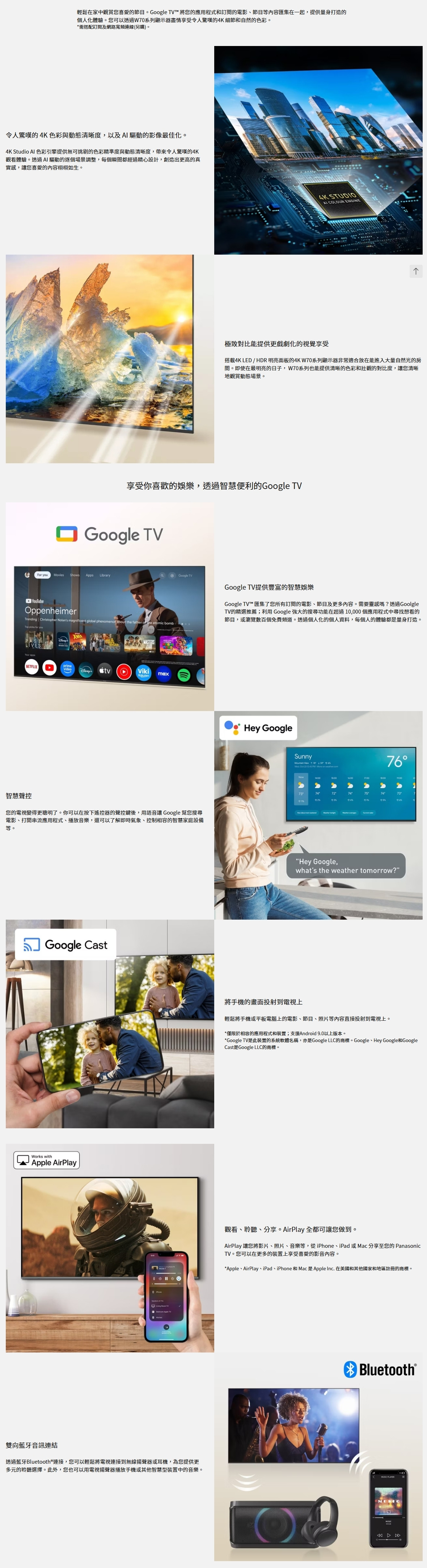 W70 4K 智慧型 LED Google TV™ 採用4K Studio AI 色彩引擎,利用 AI 分析優化視覺效果。4K LED / HDR 明亮面板可確保均衡的亮度,帶來舒適的觀賞體驗。