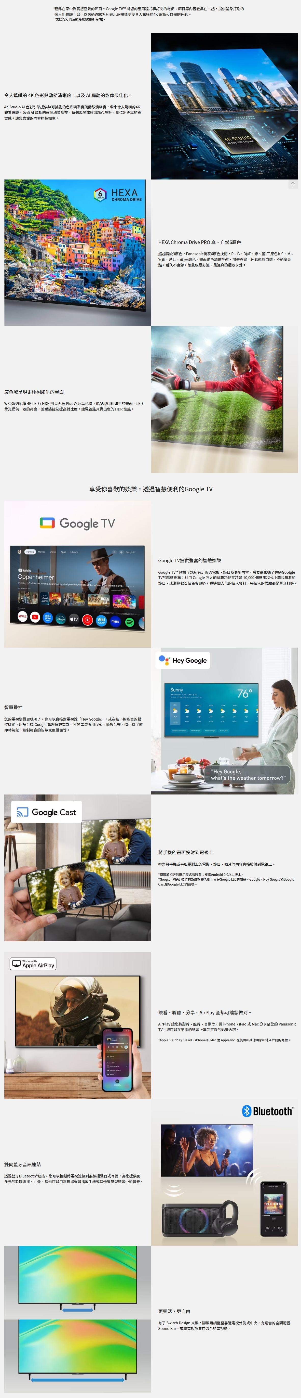W80 4K 智慧型 LED Google TV™ 將 4K LED / HDR 明亮面板 Plus 與 4K Studio AI 色彩引擎結合。 AI 驅動的分析優化了視覺效果。明亮、豐富多彩的圖像、環繞聲與遊戲模式營造出身臨其境的娛樂體驗。