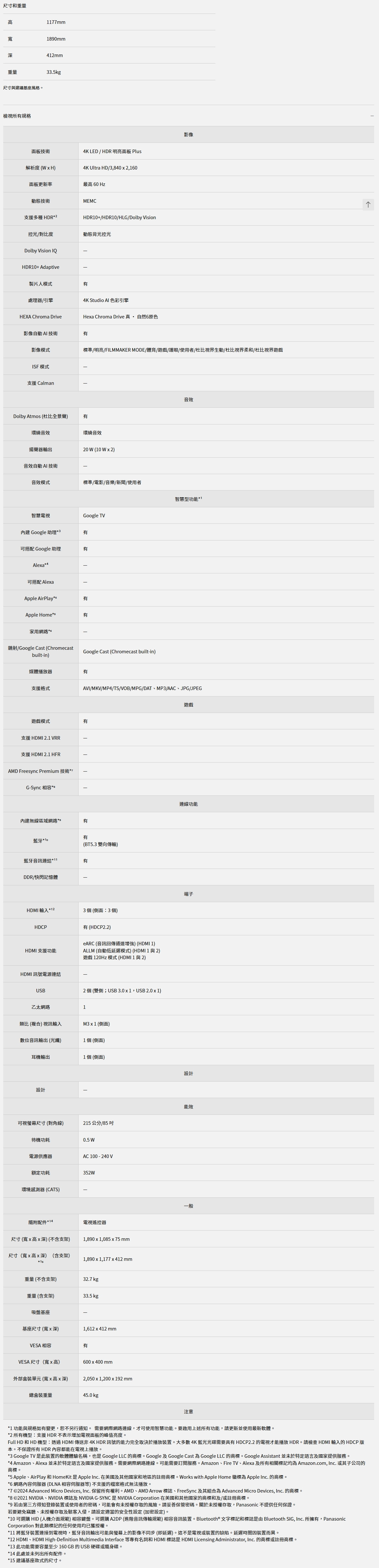 Panasonic 國際牌 TN-85W80BGT 85 英吋、LED、4K HDR 智慧顯示器