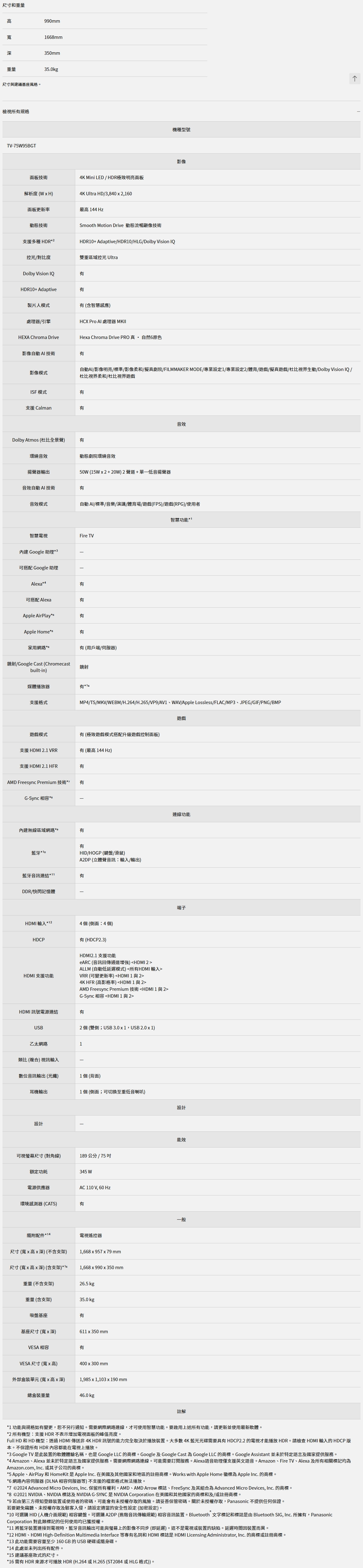 Panasonic 國際牌 TV-75W95BGT 75 吋, Mini LED, 4K HDR 智慧顯示器